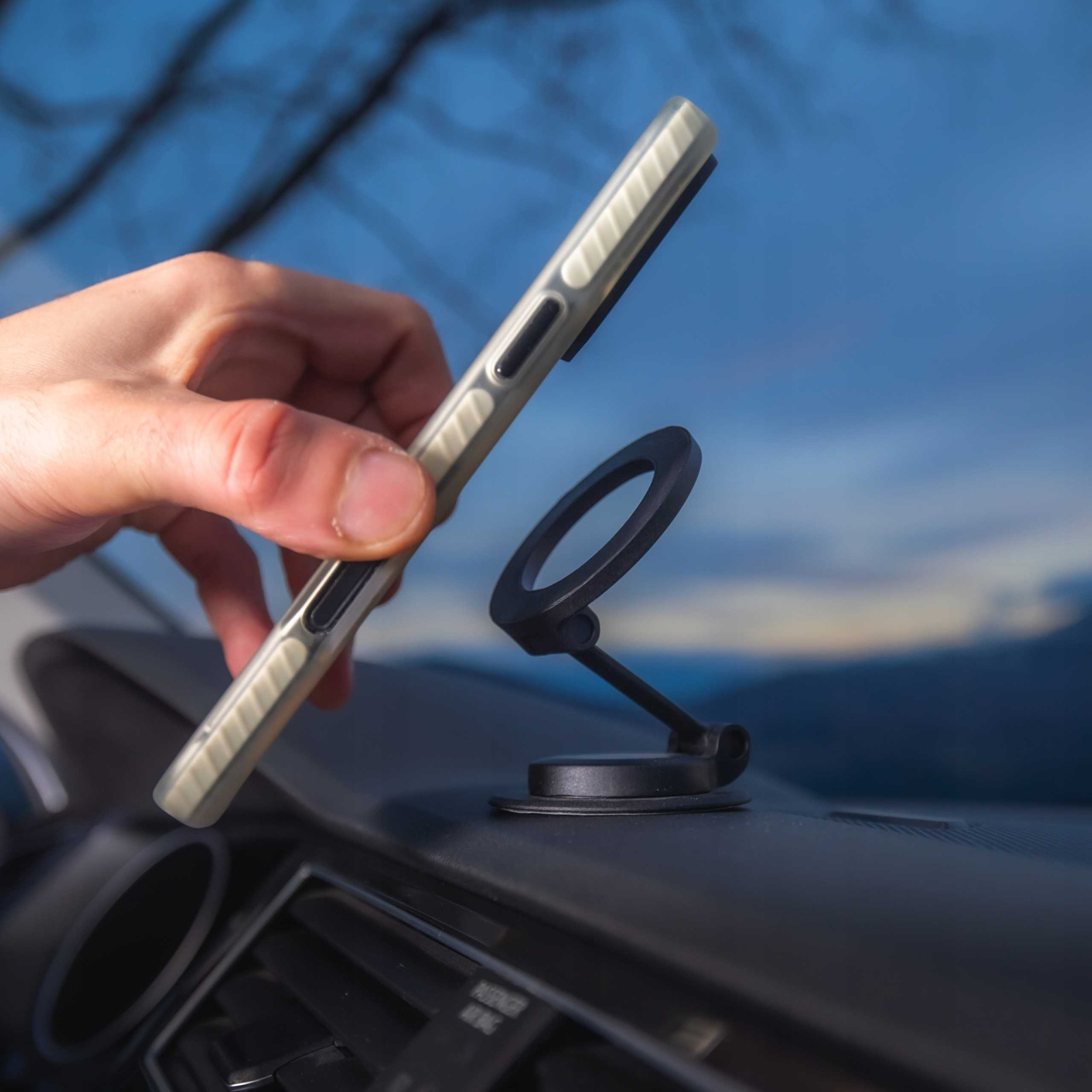 Uchwyt magnetyczny, który dzięki mocnej taśmie samoprzylepnej gwarantuje bezkompromisową stabilność montażu do każdego rodzaju płaskiej powierzchni w samochodzie, biurze czy w domu. Błyskawiczna kompatybilność z Magsafe czynią go idealnym rozwiązaniem do twojego samochodu.